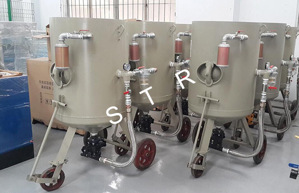 | Model STR-630 Specification One machine with one gun type Single warehouse &single gun Diameter 600mm Height 1350mm Reservoir sand amount 200L Quantity 1 Nozzle Diameter 10mm The maximum working pressure 0.8MPa |